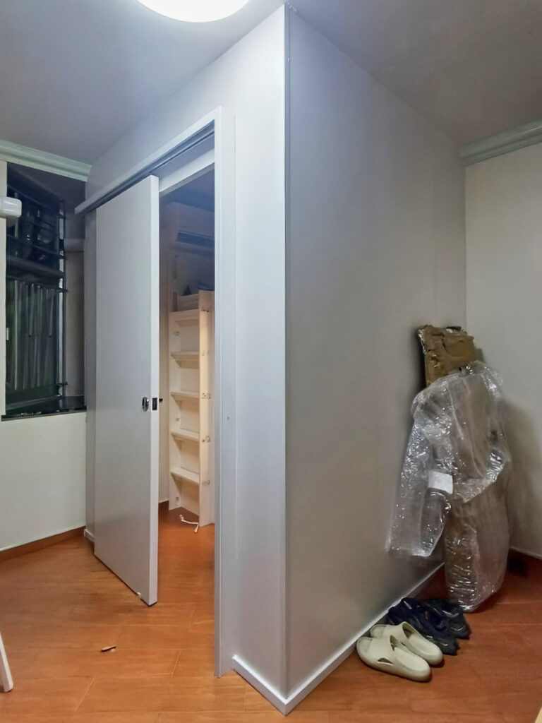 【公屋單位間兩房】 將原有空間劃分為兩間相連房,門口位置以L形組成,施工一天完成。